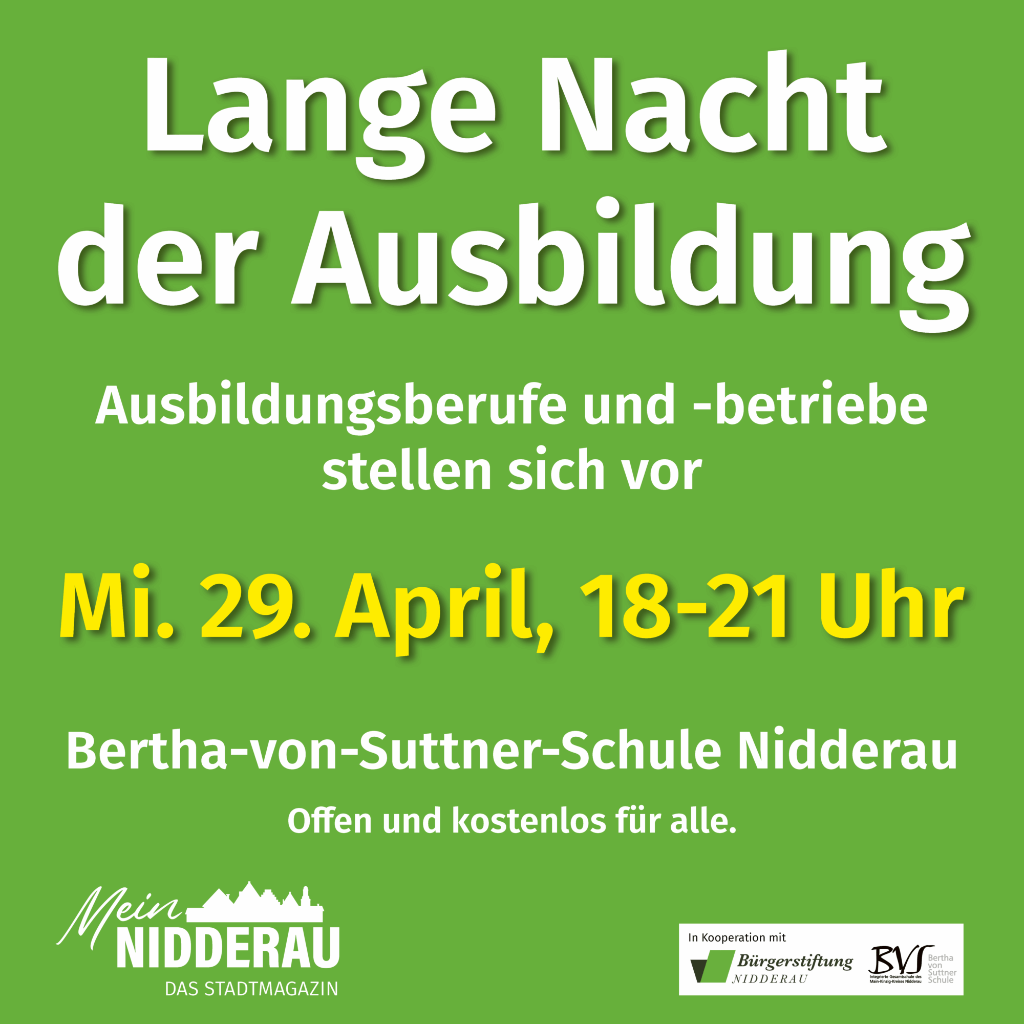 Am 29.04. und 30.04.2026 findet in der Bertha von Suttner Schule in Nidderau eine Berufsmesse sowie die lange Nacht der Ausbildung statt.